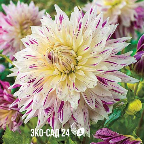 Георгина Акита Страйпед — белоснежный с сиреневыми перьями махровый сорт с цветками диаметром до 15 см. Относится к группе декоративных георгин, которые выведены для любительского цветоводства, характеризуются очень простым выращиванием, обильным цветением и дают отличный результат даже при ненадлежащем уходе. Кусты мощные и высокорослые — до 1 метра. Цветение — с середины лета до первых ночных заморозков осенью. Великолепный сорт и в срезке, и на клумбе. Без выкапывания клубней выращивается как однолетник.